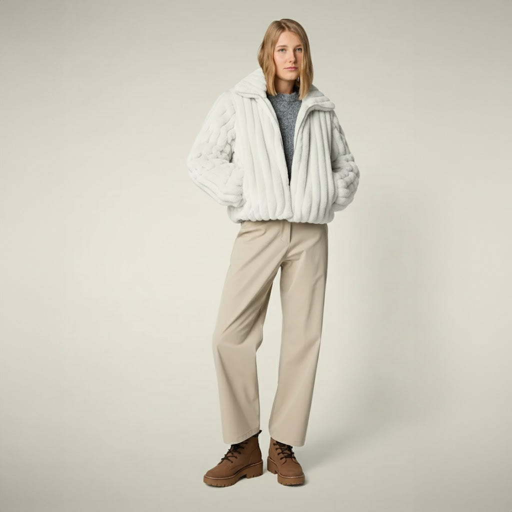 The “Elina” fleece jacket combines timeless design with modern details, featuring a slightly cropped straight cut, softly defined shoulders, voluminous elastic-cuff sleeves, vertical quilted texture, and practical elements like a zip closure, high stand-up collar, and deep side pockets—all crafted from lightweight plush fleece in line with Save The Duck’s eco-friendly, animal-free philosophy.