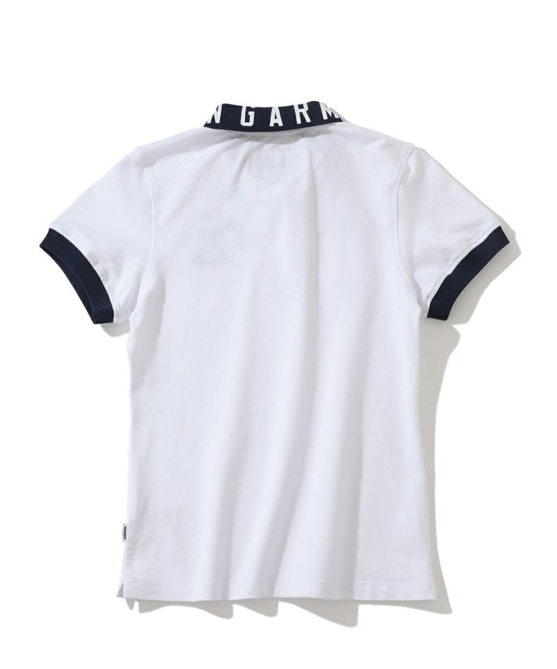 Short-sleeved polo shirt in bare jersey material. Brand logo in classic font design is printed on the collar and cuffs, and the brand logo in vintage American design is embroidered on the left chest. Brand name is tucked into the right chest pocket, and a pith label is tucked into the left side. The front placket is a standard detail that combines a sunglass holder.