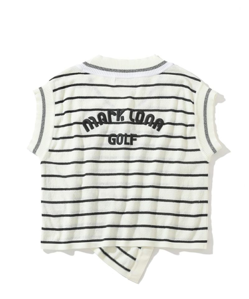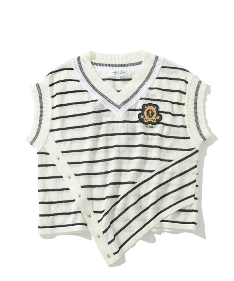 Authentic border V-neck knit vest with lightweight and dry touch for early summer golfing. Crest embroidery-style presto wappen logo metal plate with precise expression on the left chest and three-dimensional rounded logo design embroidery on the back. Straight body, cropped length, dropped shoulders, and asymmetrical hem create a trendy silhouette. The pattern is designed for layering for play, allowing for an easy swing despite the unique design. For town use, dare to wear it alone and enjoy the slightly oversized silhouette.