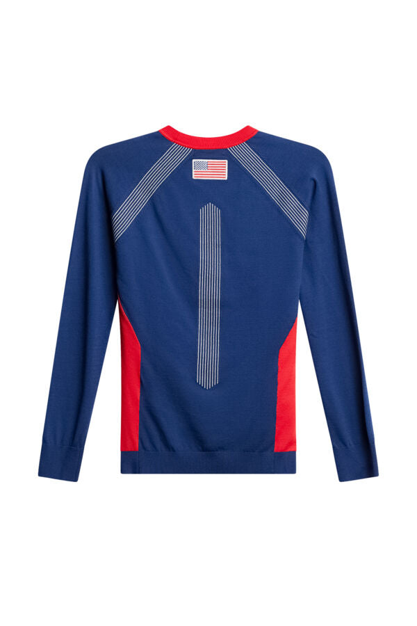 Indulge in the luxurious comfort and natural performance of our form-fitted Josette ribbed knit Sweater crafted from a blended fabric. It features raglan sleeves for enhanced mobility and is adorned with contrasting ribbed details and knitted panels. With exquisite Bridge logo embroidery and USA logo embroidery, it seamlessly blends elegance with patriotic flair.