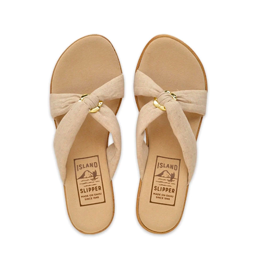 The P 367 features a selection of our solid Linen fabric slide. The straps are foam filled, soft on the foot and accented with a metal ring. For the foot bed we have combined a special foam midsole and Ultrasuede ® in a combination that provides the soft feel of suede that is durable and water washable. The P bottom is a lightweight 2 ½" platform with just the right amount of lift that makes this slipper comfortable all day long. Made in Hawaii USA.