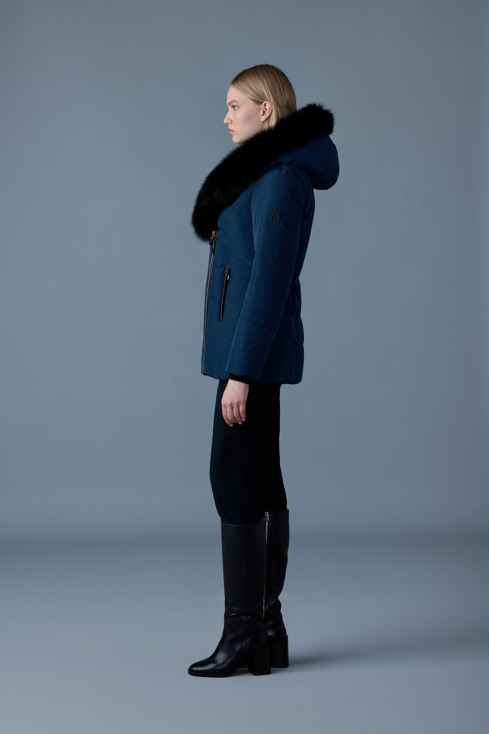 ADALI is a recycled down coat for women featuring our Signature Collar with blue fox fur and an asymmetrical zip closure. Lab tested to protect with weight-to-protection ratio, it has an inner bib with rib collar, hidden hood toggle, and storm cuffs. Water resistant, repellent, and windproof, insulated leather welt pockets add warmth and protection. A design-forward winter essential elevated with thoughtful tailoring.