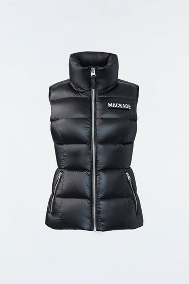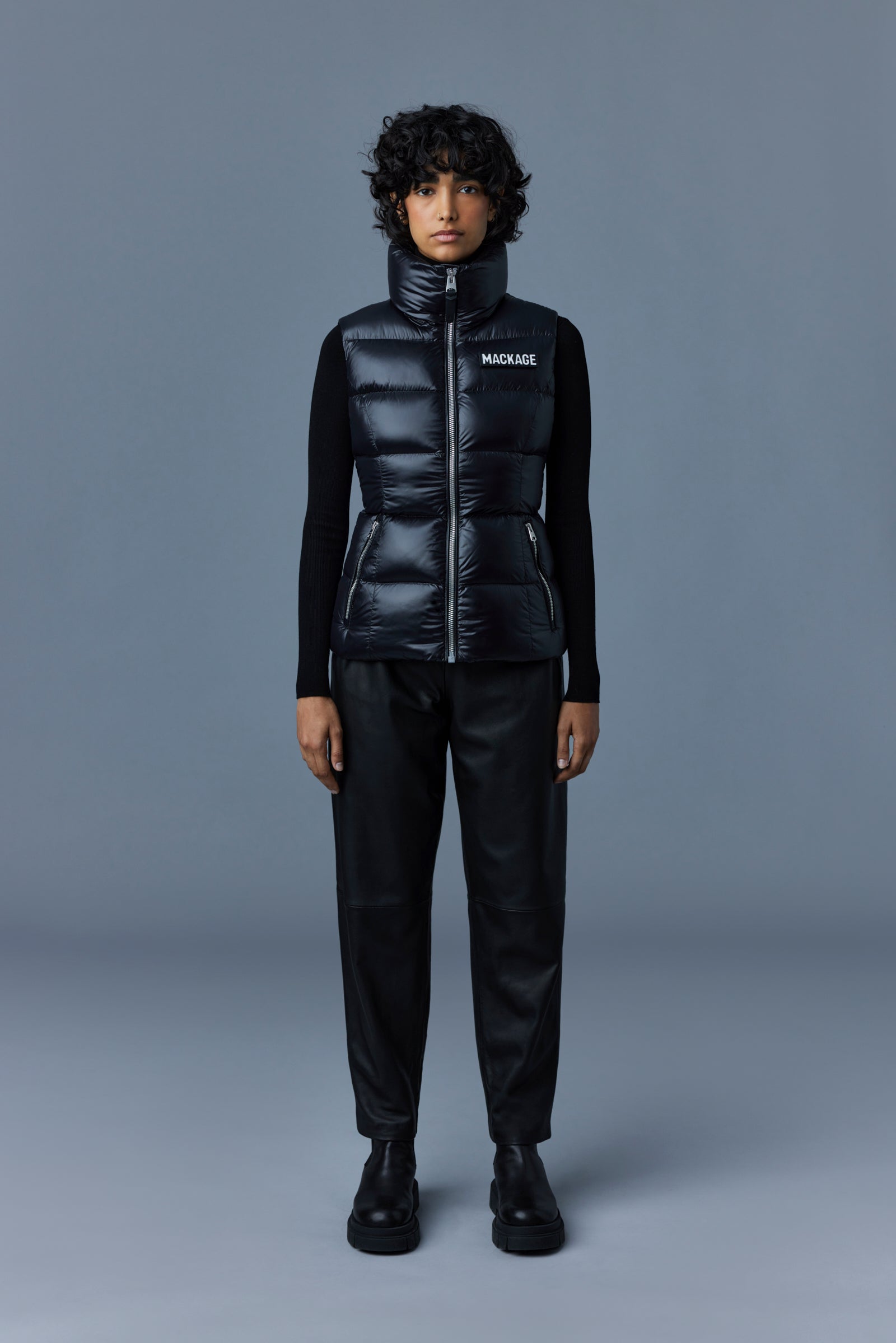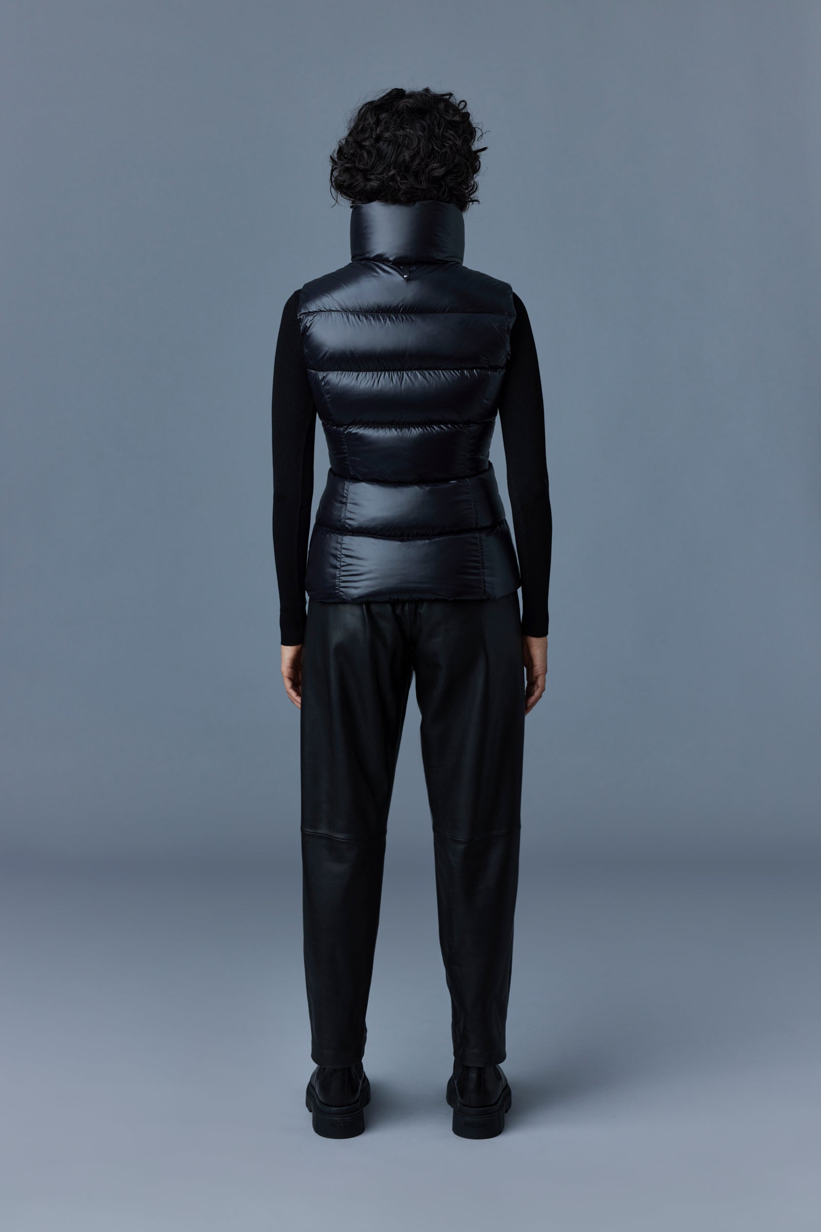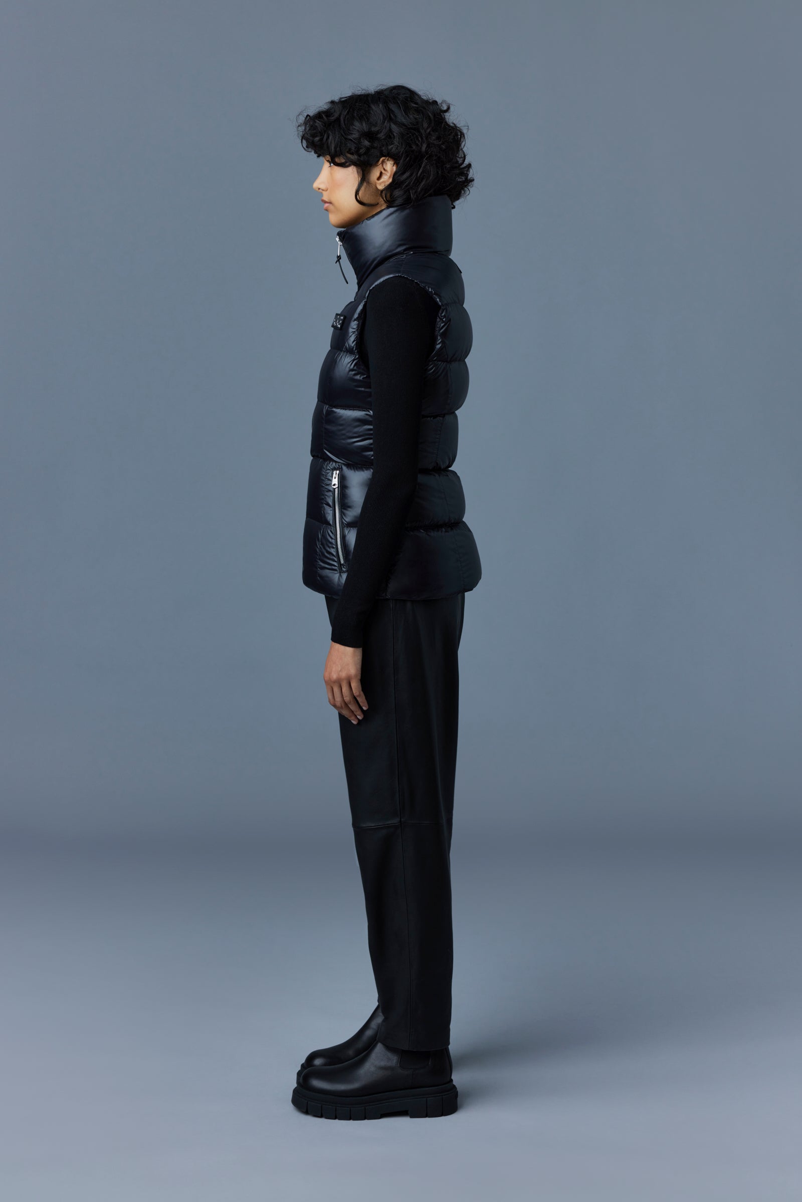 CHAYA is a recycled light down vest for women with a streamlined silhouette. Meticulously made from a high-sheen shell that is perfectly warming, it shows paneled channel quilting. The generous funnel collar and zip waist pockets bring comfort on cooler days. Detailed with a signature wordmark patch and contrast lining.