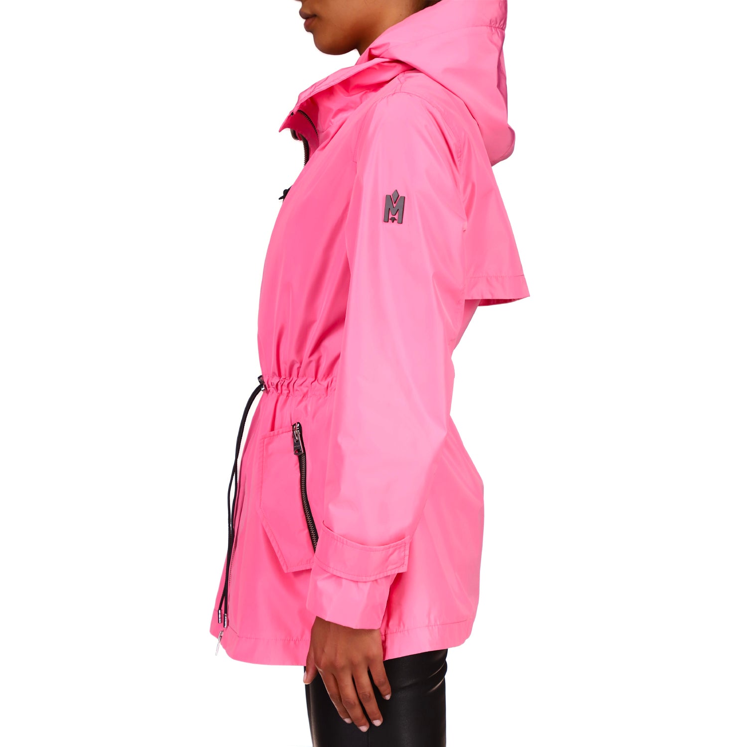 MELANY is a mid-length rain parka featuring a removable bib with an adjustable storm visor hood. Crafted from a 100% recycled 2-layer water resistant shell, it flaunts a semi-fitted cinched silhouette with a drawcord waist. Cuff tabs and dual-entry zip pockets lend further adaptability. Perfectly tailored, a sleek style with high-function.