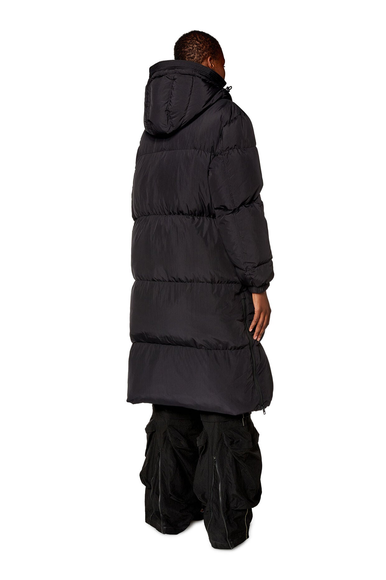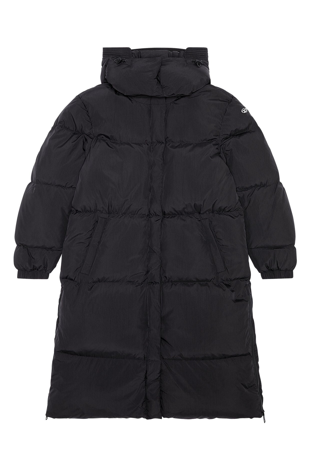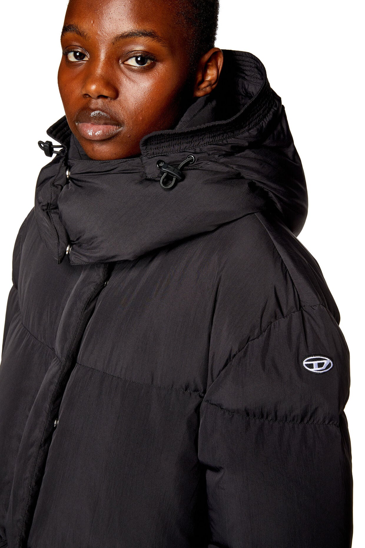 Regular-fit puffer coat built from certified recycled nylon taslan with a special ViralOff finish. This super-lightweight women's style features a detachable visor hood and an embroidered Oval D patch on the left sleeve. Padded with down.