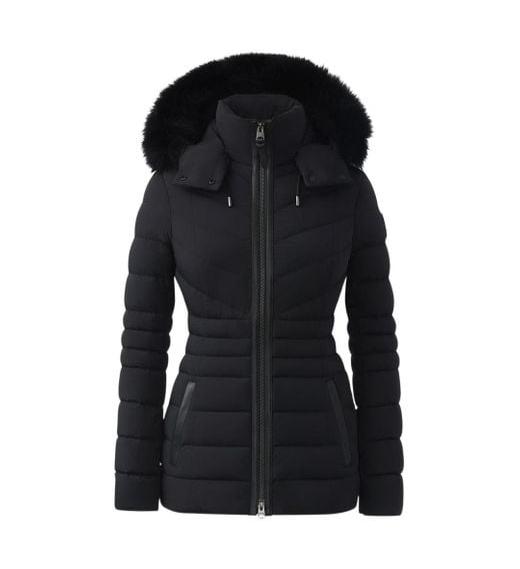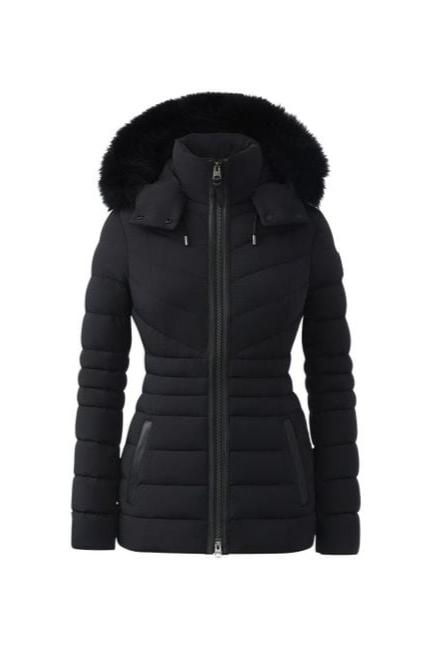 - Shell (Woven): 82% polyamide/nylon, 18% elastane/spandex. Combo 100% cow leather. Lining: 82% polyamide/nylon, 18% elastane/spandex. Filling: 90% chinese pure white goose down, 10% feathers. Fur: 100% finland blue fox. Water-repellent & water-resistant.