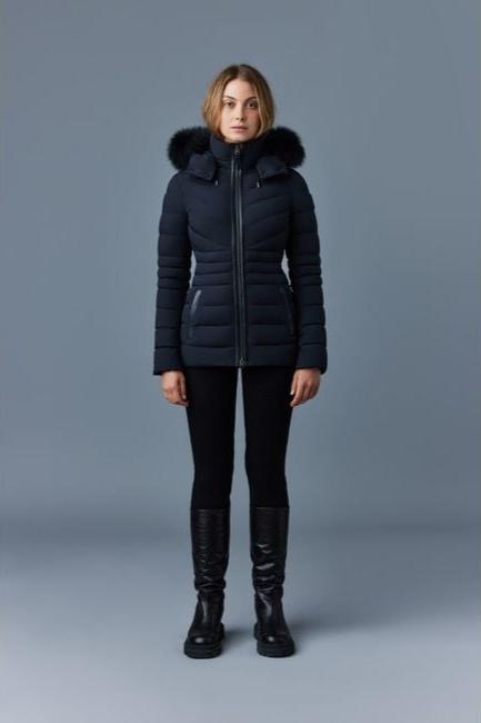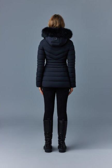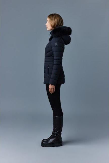 PATSY is a classic mid-length jacket for women meticulously tailored from our proprietary light recycled down and Agile 360 stretch shell. Combining sleek lines with high-performance, the removable hood boasts a plush sustainable blue fox fur trim that can be detached on warmer days. Graphic chevron quilting and sustainable leather detailing accentuate the form-fitting silhouette.