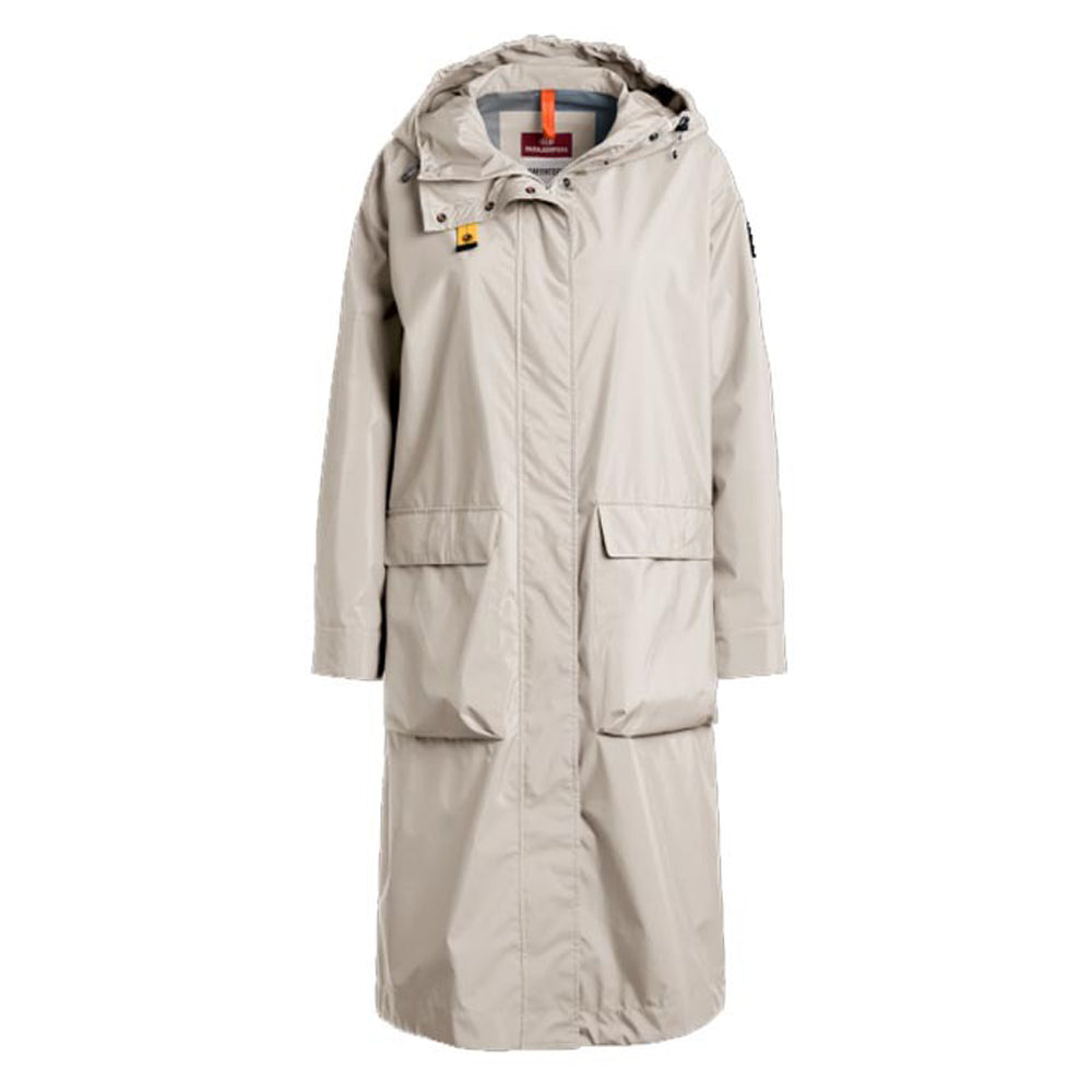 Light waterproof long jacket with hood adjustable by means of drawstring and partially taped seams. Crafted in a 3-layer fabric with recycled polyester with a polyurethane lamination and a water repellent treatment on the face, and polyester on the back. Two-way zipper with button-up storm flap. Two snap flap pockets, one inner mesh pockets. Buttoned cuffs, underarm ventilation and Parajumpers print on the back (only in the 776-Atmosphere version). Iconic yellow elastic neck closure and PJS patch.