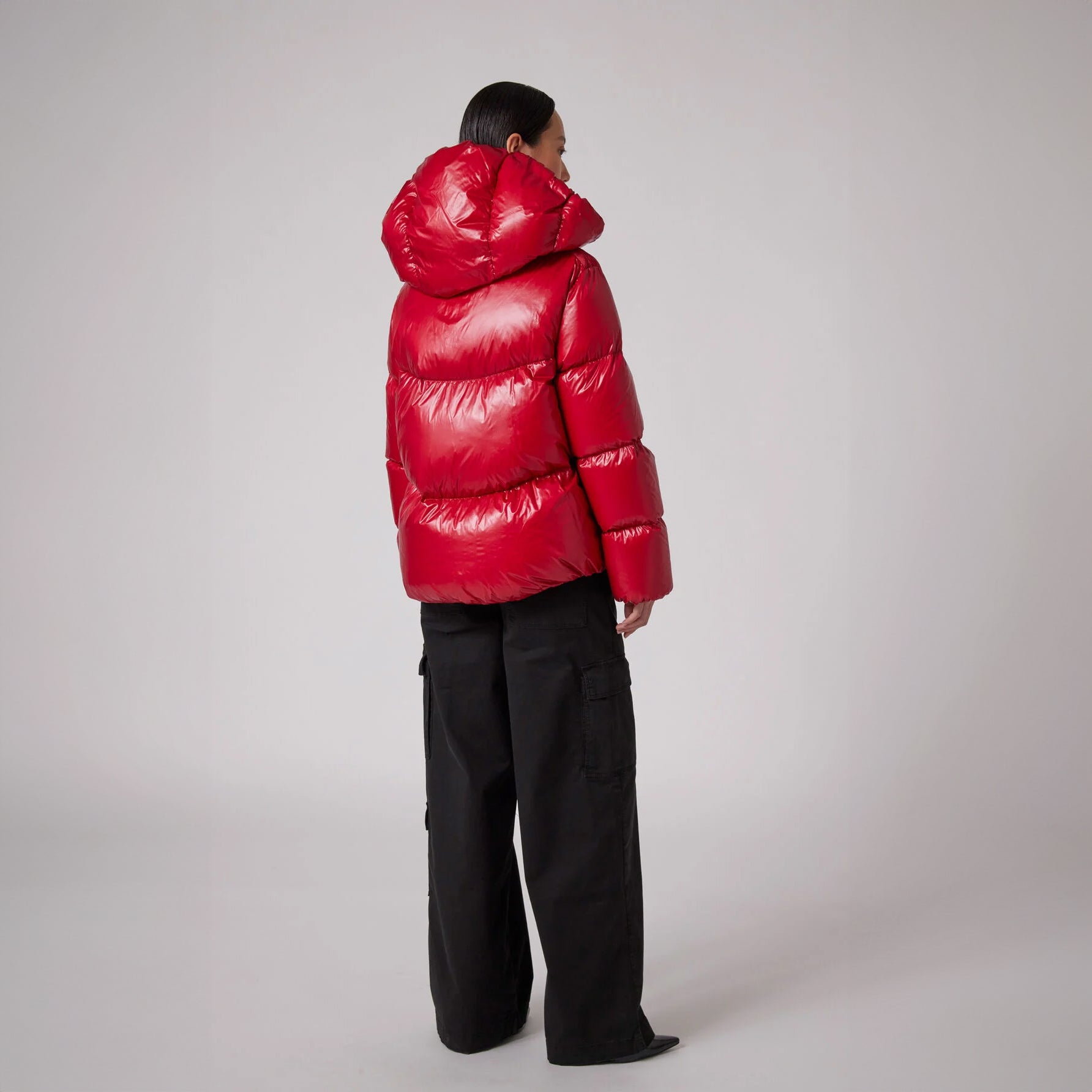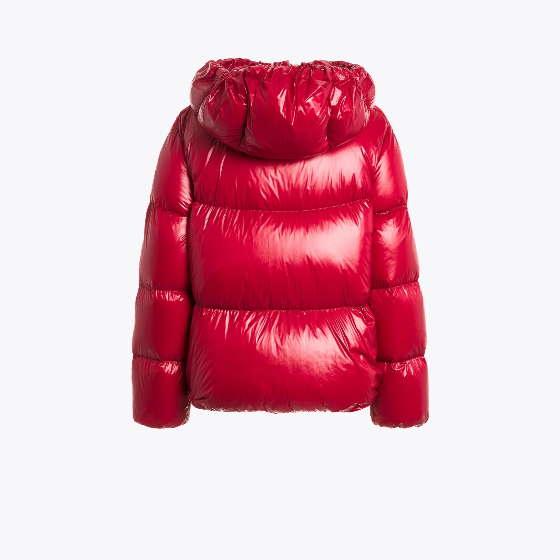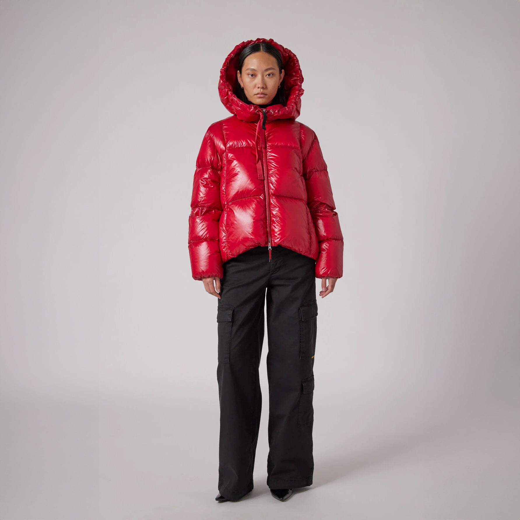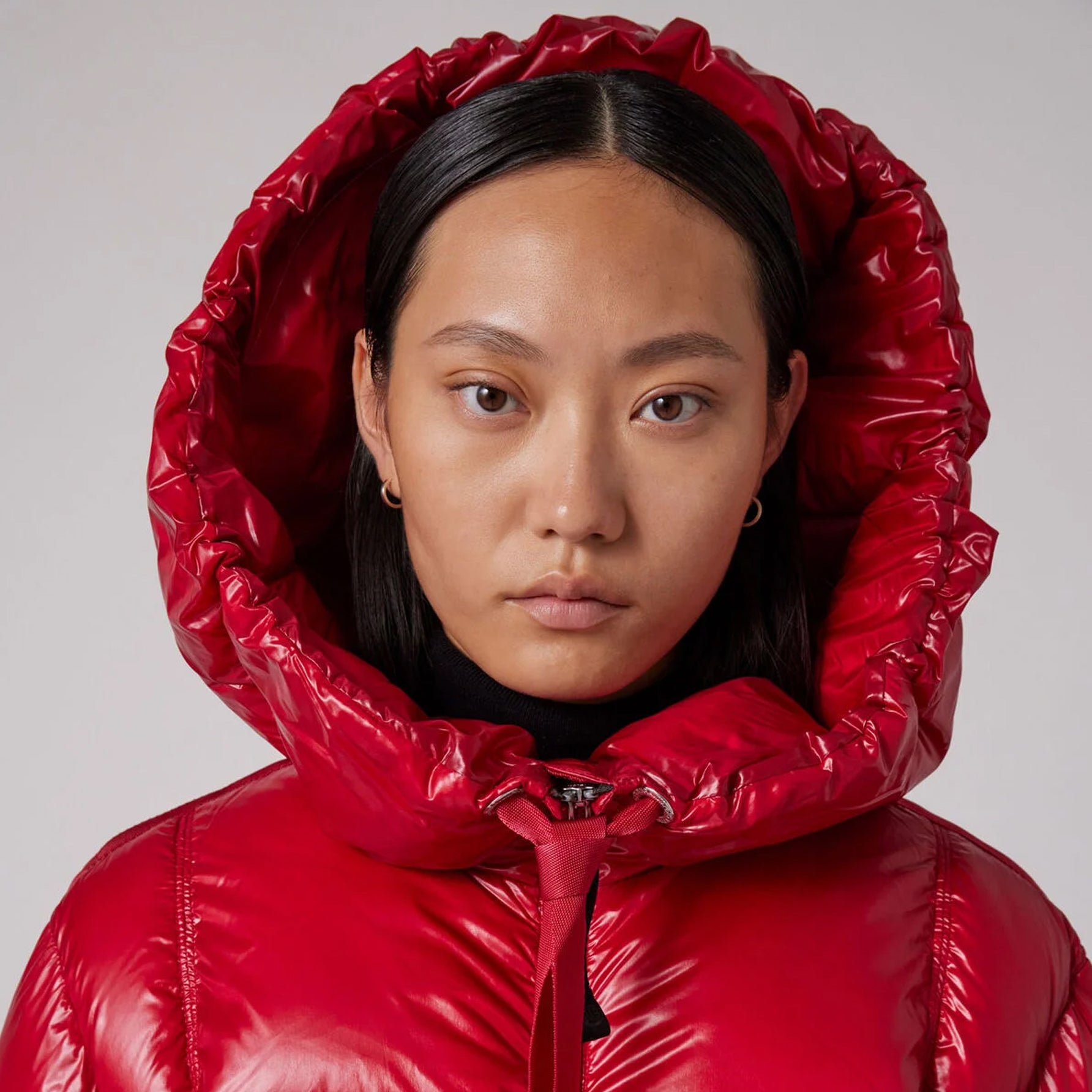 Water Flower is a short quilted down jacket made of lightweight, shiny nylon taffeta, from the Flower Puffers family. The silhouette of the wide hood resembles a flower and can be shaped around the face or opened over the shoulders to recreate the effect of a shawl.
