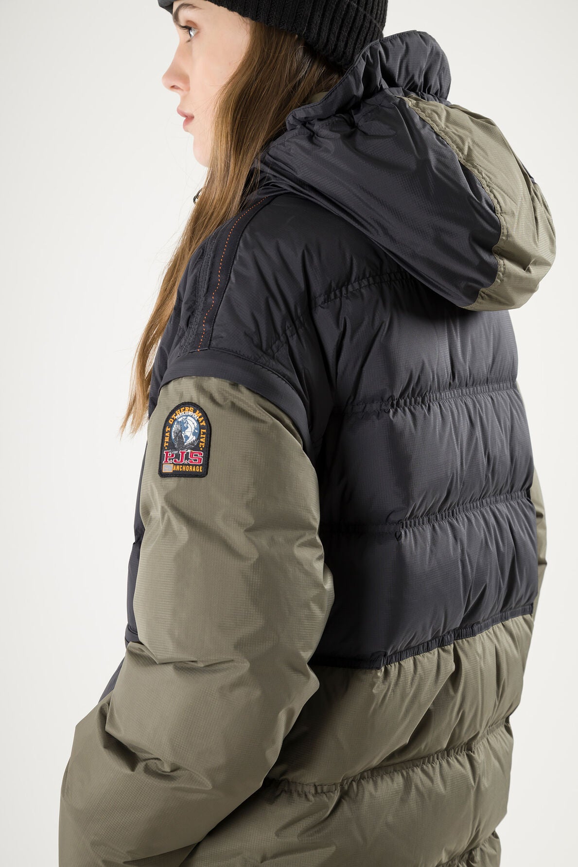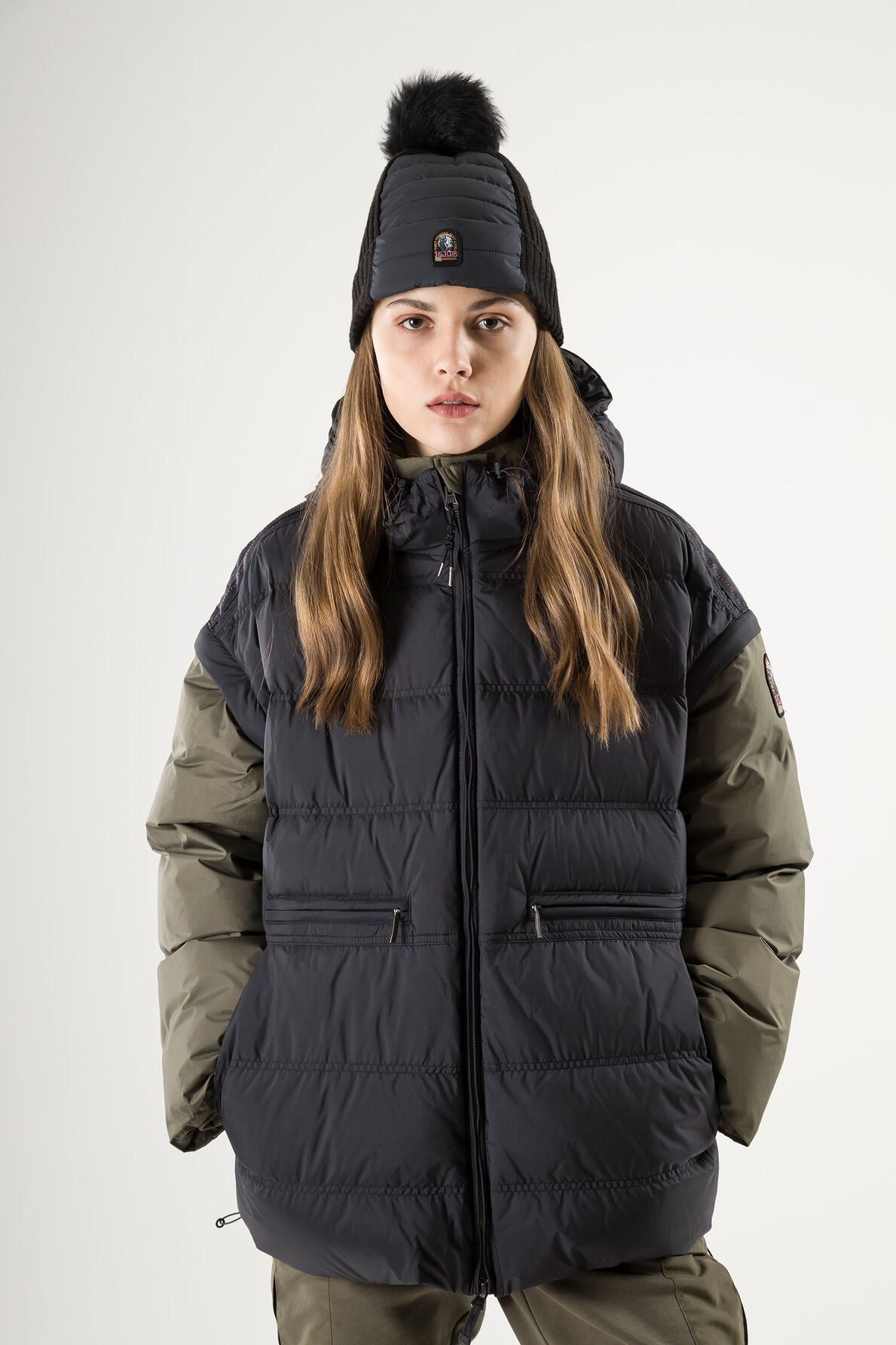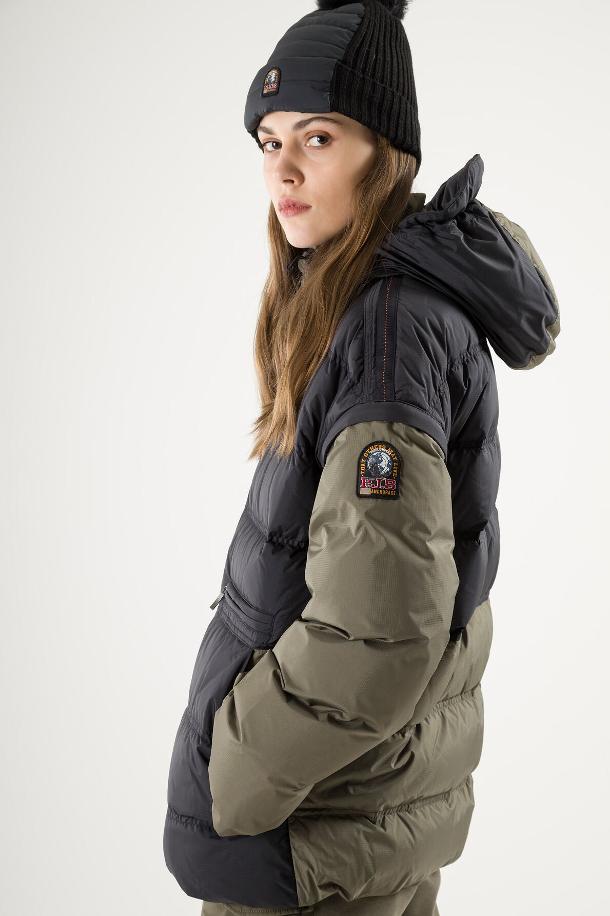 The fabric is a 100% biodegradable nylon ripstop. Filling is 90% duck down – 10% duck feathers. This jacket has a hood adjustable by means of drawstring and a two-way zipper. It features two zippered front pockets, two pockets, one inner mesh pocket, zippered detachable sleeves. Bottom adjustable by means of drawstring. It features iconic details such as the yellow elastic strap and the patch.