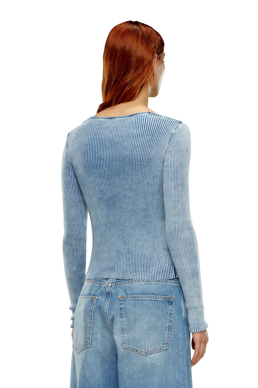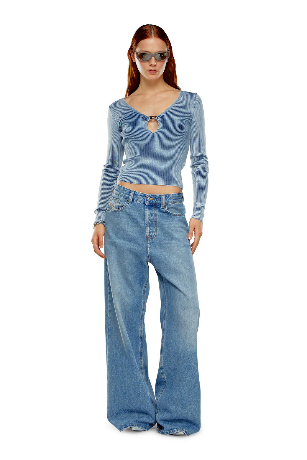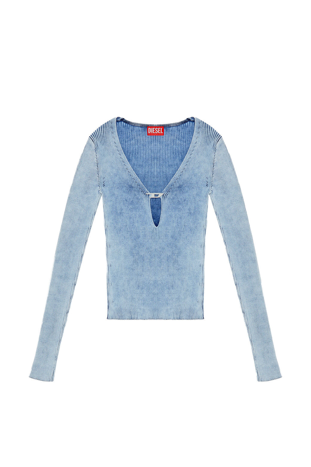 This women's long-sleeve top is embellished with a metal D plaque that pinches the deep neckline, creating a keyhole cut-out. Knitted using indigo-dyed cotton yarns, it shows an icy blue wash with sharp tonal contrasts and 'spider web’ effect marbling. The ribbing ensures a flexible, close fit.