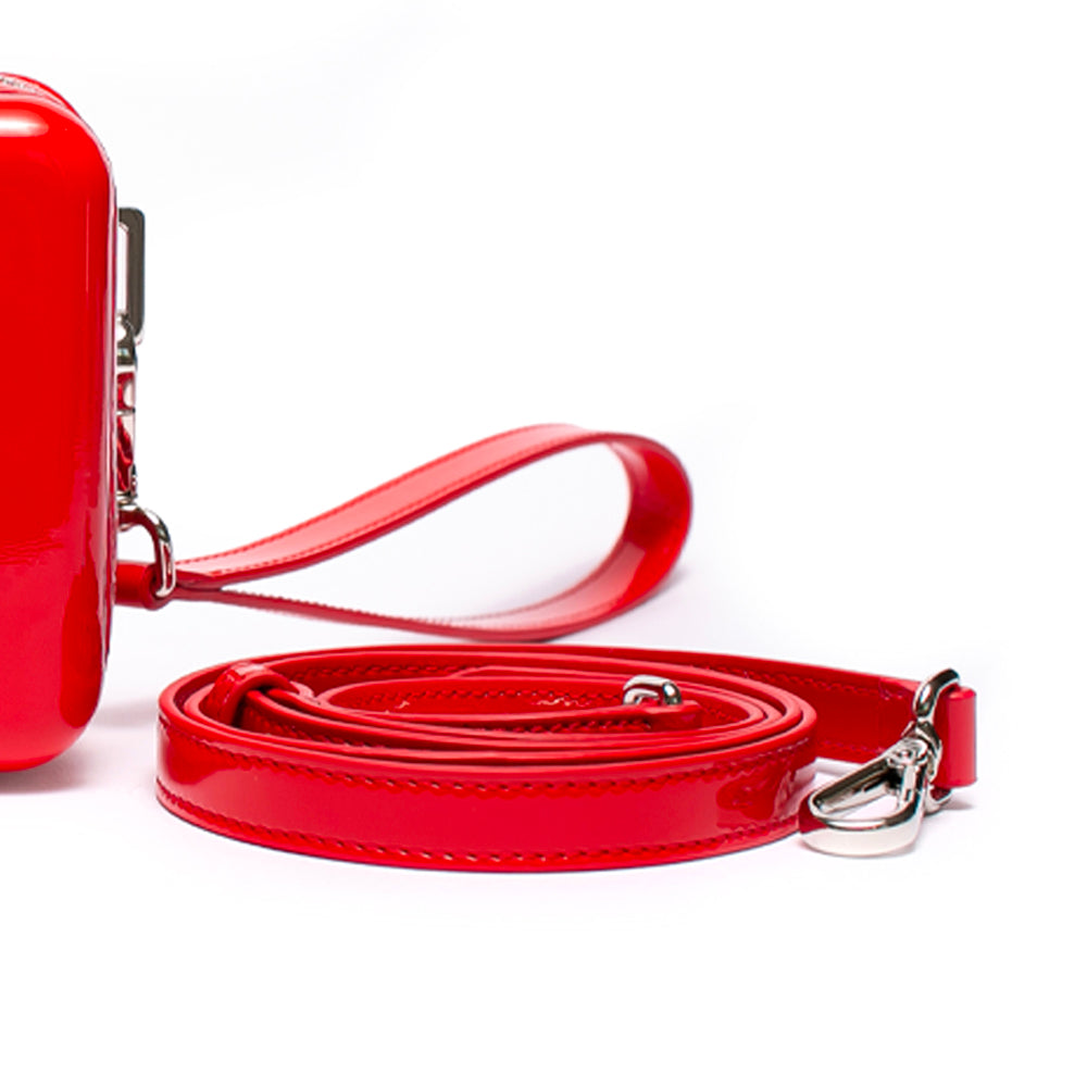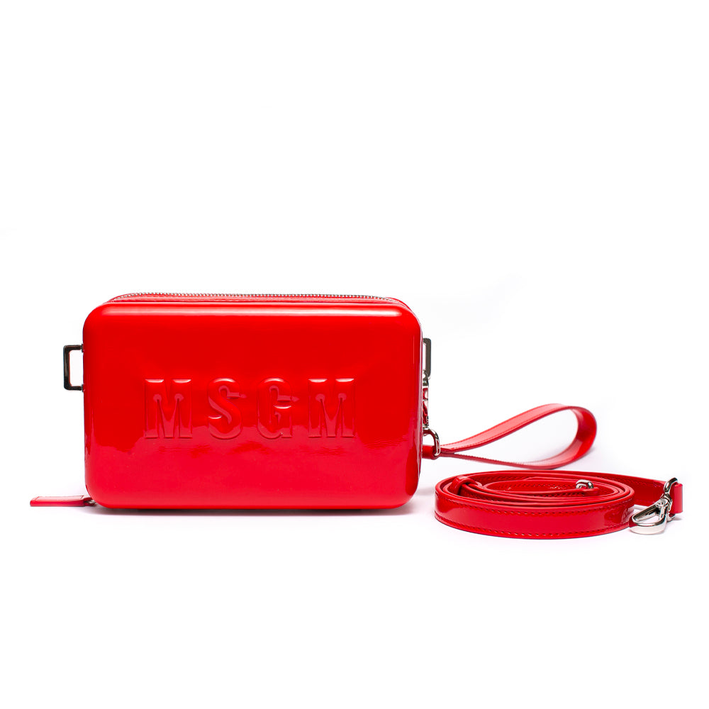 Rigid patent leather pouch with embossed large MSGM logo. Removable shoulder strap and zipper closure. Measurements: 18 x 11 x 7.5 cm