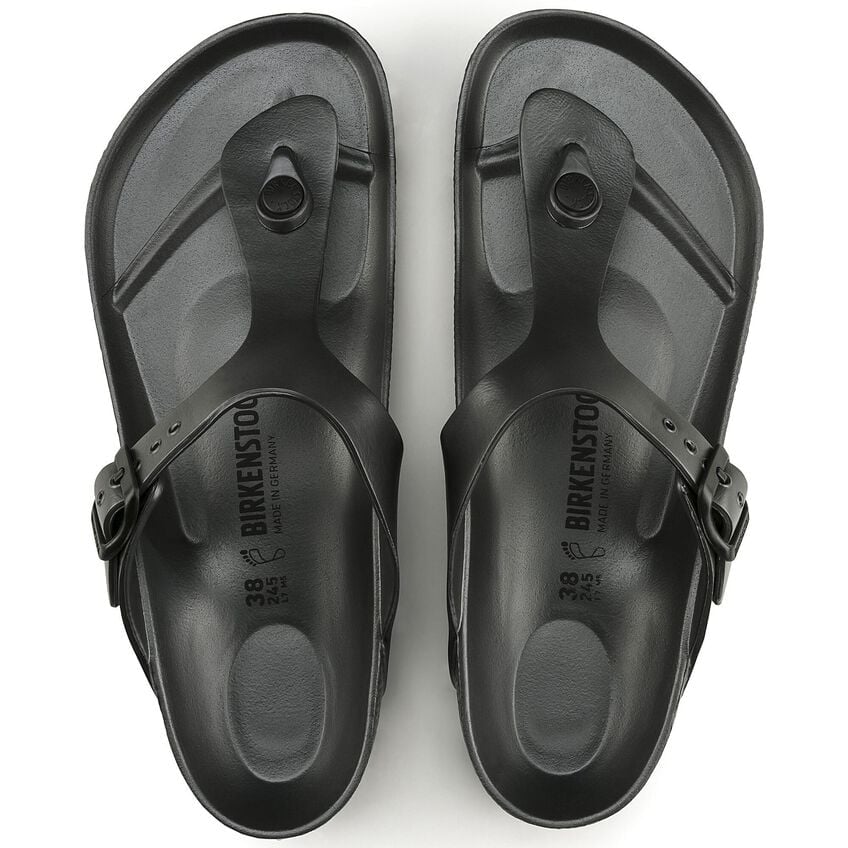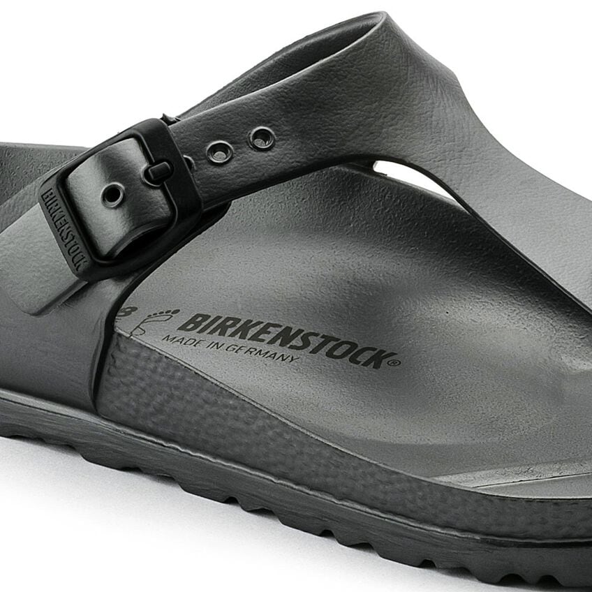 The BIRKENSTOCK Gizeh is our classic thong sandal. Modeled on the cork original, this sandal is made from ultra lightweight and highly flexible EVA. These colorful sandals are shock-absorbent, waterproof, and skin-friendly. Wear them at the beach, in the garden, or in wellness and spa areas. It's the perfect addition to your classic BIRKENSTOCK sandals.