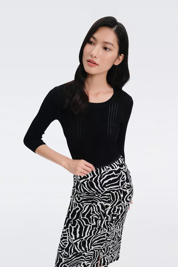 Sleek and simple. Cut from a lighter knit, the Vlada sweater is fitted yet comfortable with a ribbed texture. With classic elements like a slight scoop neck and three-quarter sleeves, it's bound to elevate your wardrobe as a layering staple or the perfect match to any bottoms.