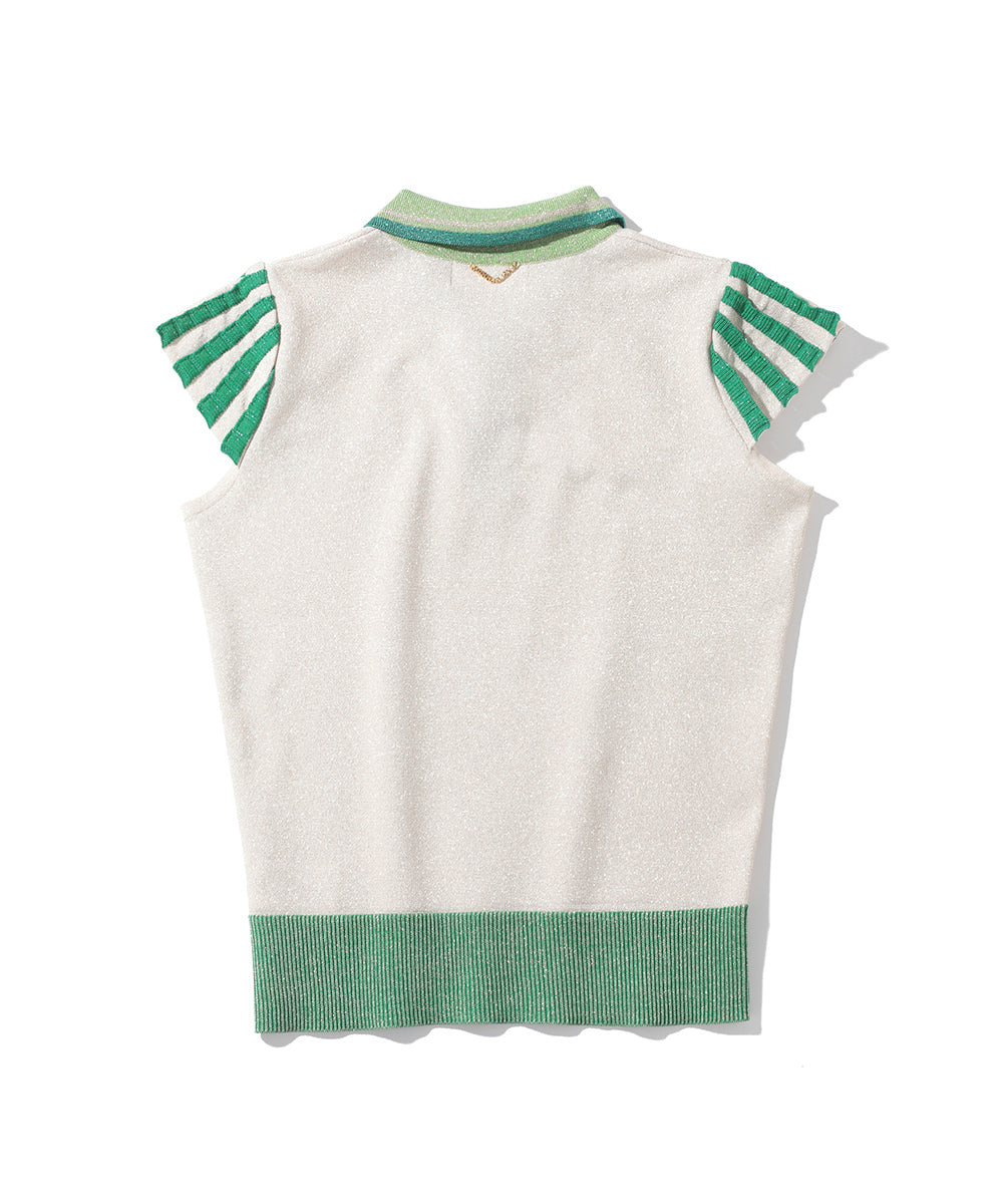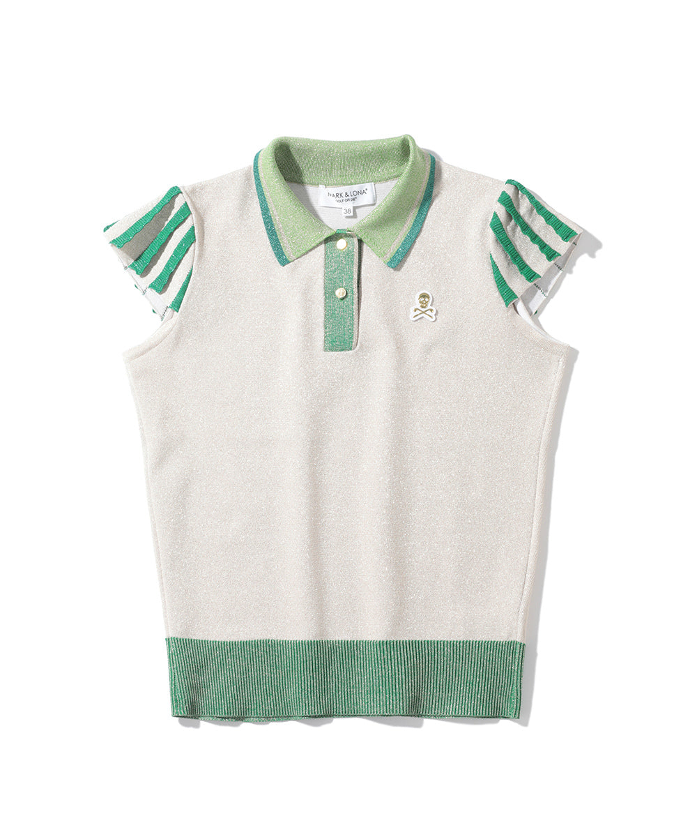 Gorgeous lamé jacquard summer knit polo with sleeve ruffles and all-over lamé. Metallic iron skull on the left chest, logo charm on the center back, and metallic engraved flat buttons on the front. The ribbed hem creates a waist-marking silhouette with just the right amount of room to keep a flattering, flattering style. The sleeves have flared sleeves with vertical ruffles, which show off the arms and create an elegant, classical mood. It goes well with just-waisted bottoms and is recommended to coordinate with the pleated skirt (MLW-3A-AE05) with which the design is linked.
