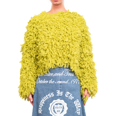 Exotic, obssessive, hallucinatory, in the brushed mohair outerwear, in the prints on poplin or twill. Super fluffy sweater which looks like fur. Crop sweater with rounded collar and long sleeves.