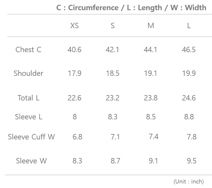 | Sleeve Length (cm) | 84/85 | 85/86 | 86/87 | 87/88 | 89/90 | 90/91 | 91/92 | 92/93 |