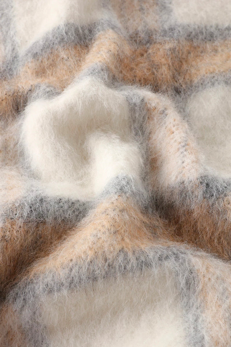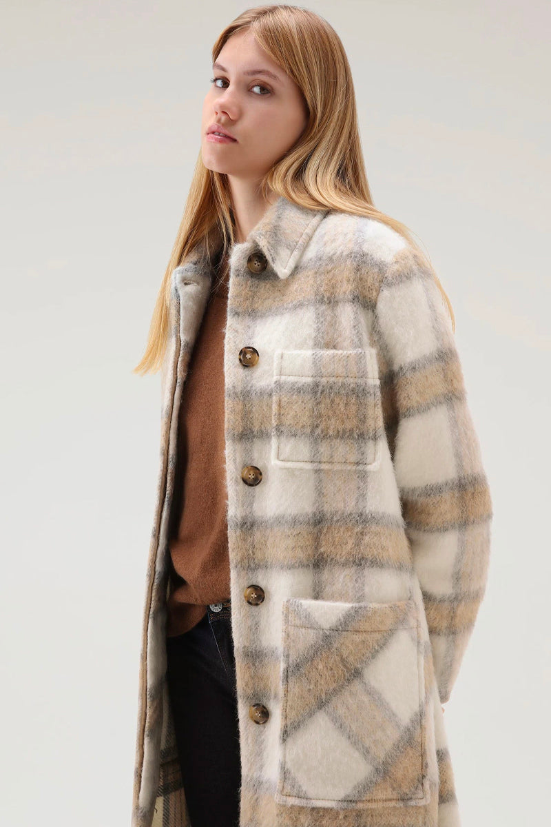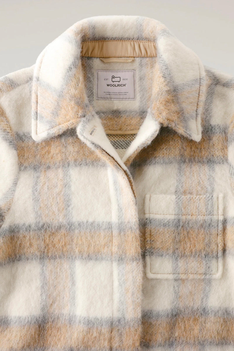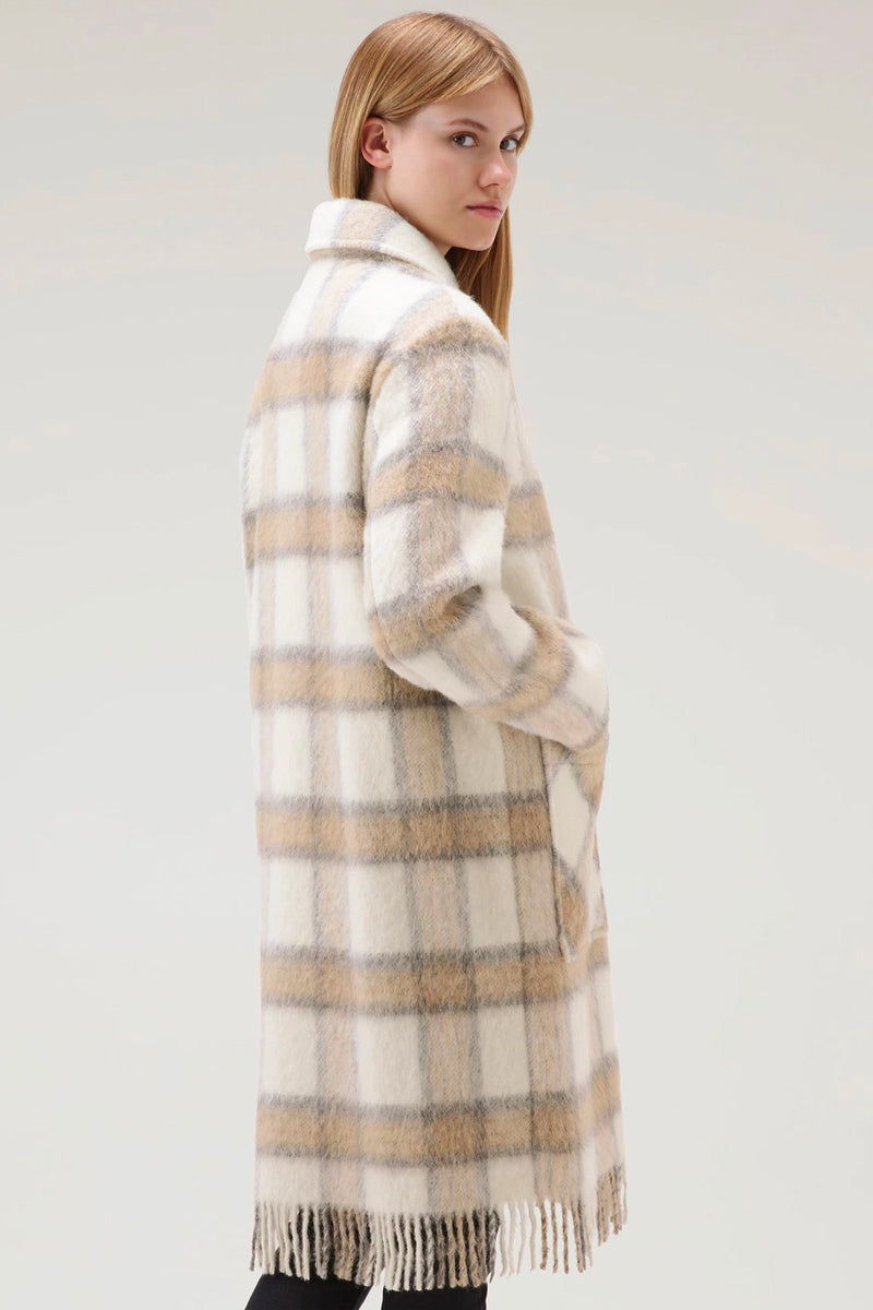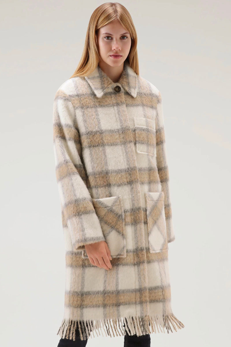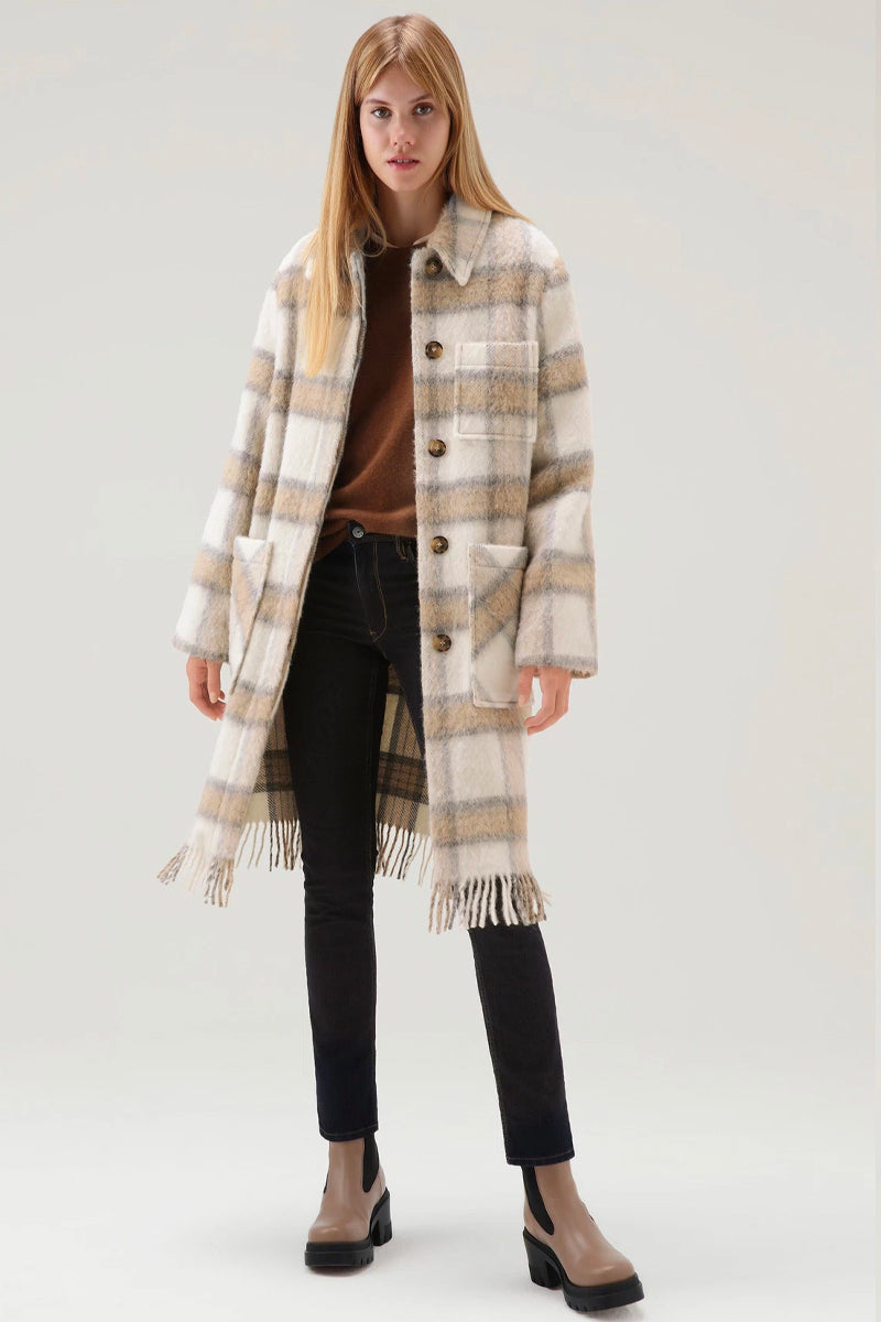 Brushed Wool Long Overshirt with Fringe Cream Check