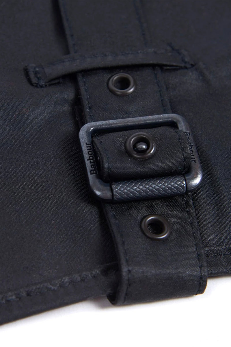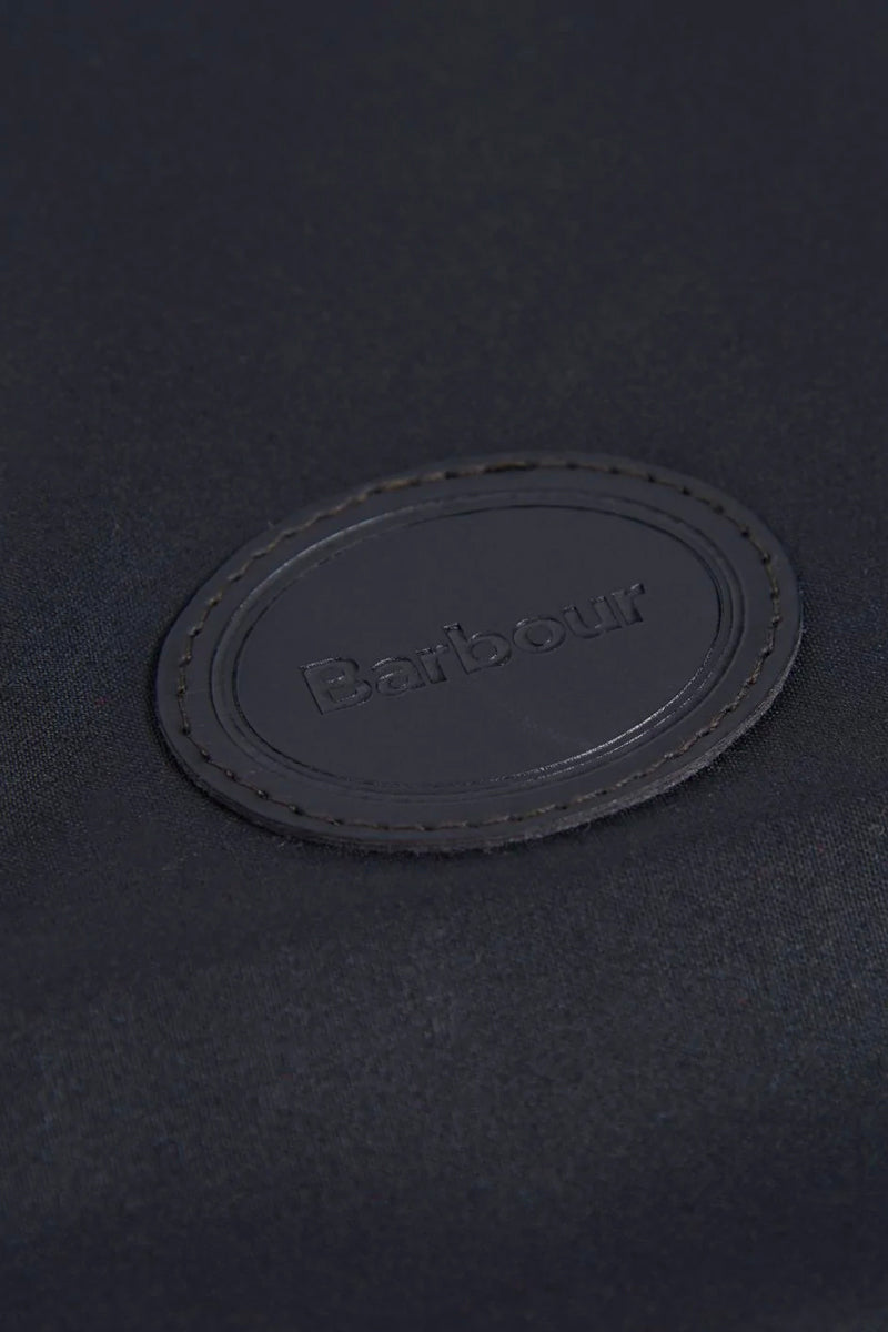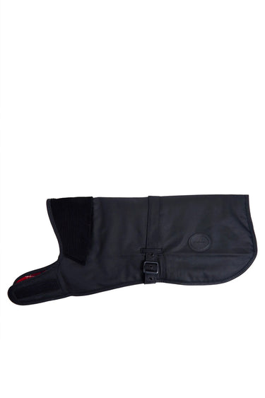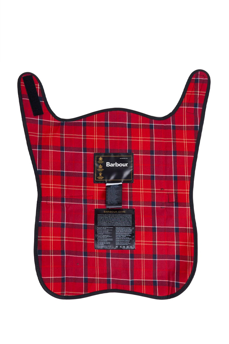 Waxed cotton Barbour dog coat with cotton tartan lining and lightweight wadding between. Cord collar detail and Velcro fastening underbody strap. It's complete with Barbour branding.